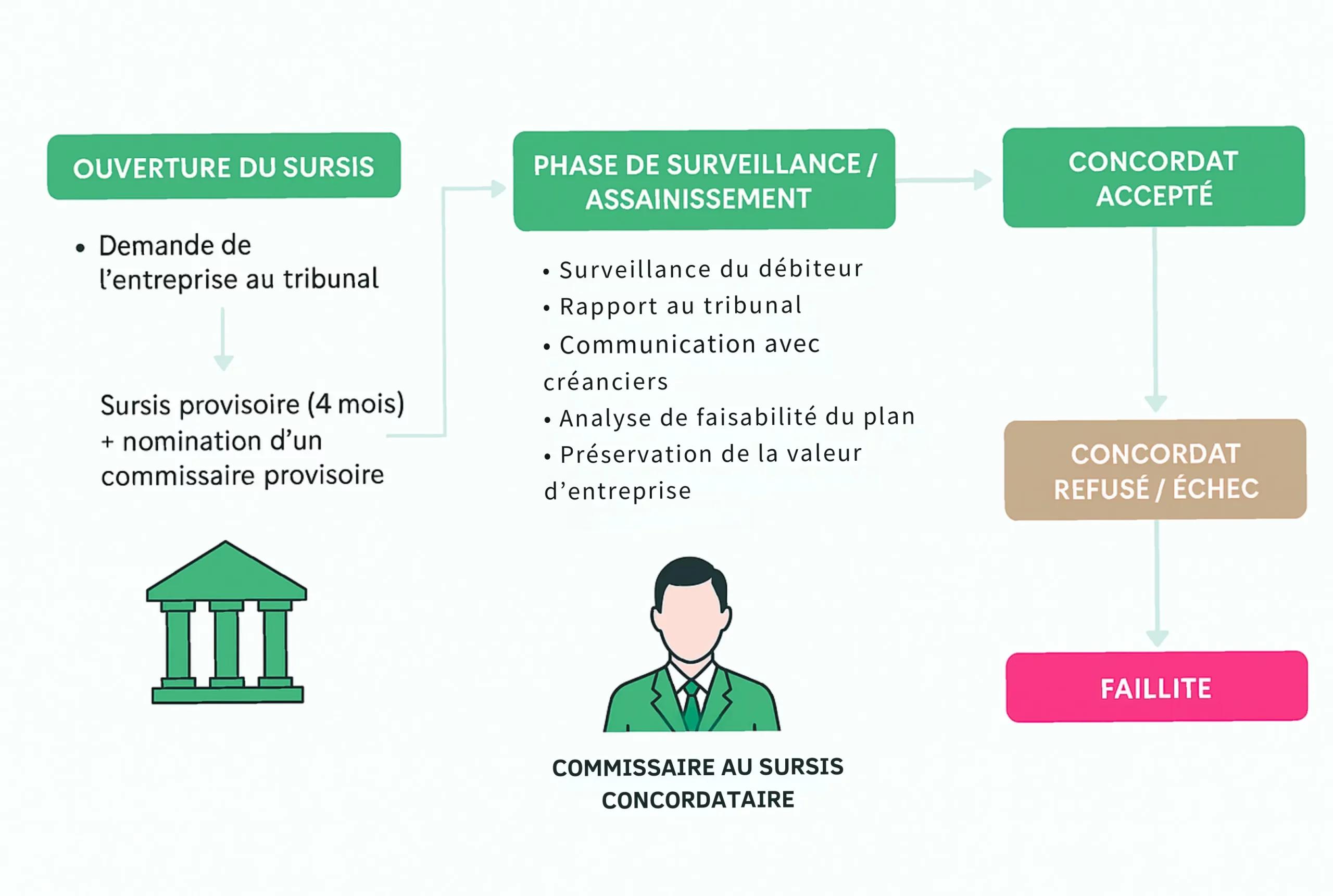 Schéma du processus de sursis concordataire en Suisse : ouverture du sursis, phase de surveillance par le commissaire, puis issue : concordat accepté ou faillite en cas d’échec.