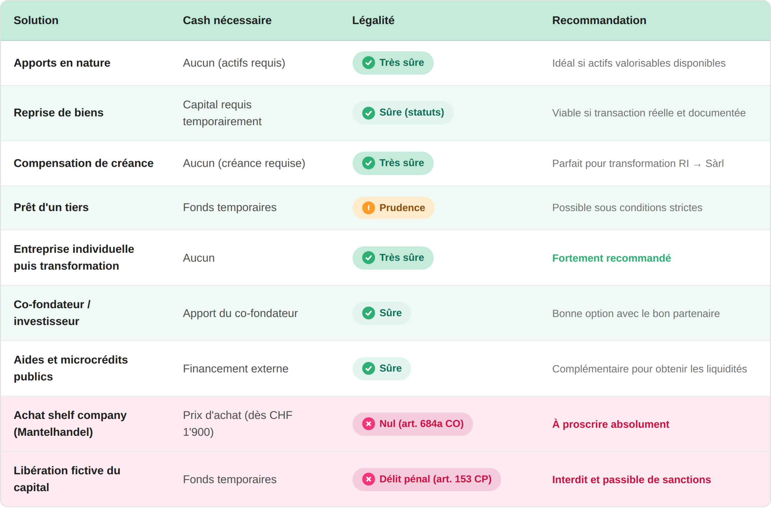 Les solutions légales de création d'entreprise en Suisse existent: apports en nature, apport en numéraire différé via l'entreprise individuelle, financement par microcrédit, et elles sont accessibles à la grande majorité des entrepreneurs motivés. Les raccourcis comme les sociétés coquilles ou la libération fictive sont non seulement illicites, mais aussi économiquement risqués en raison de la double imposition et des conséquences fiscales qu'ils engendrent.